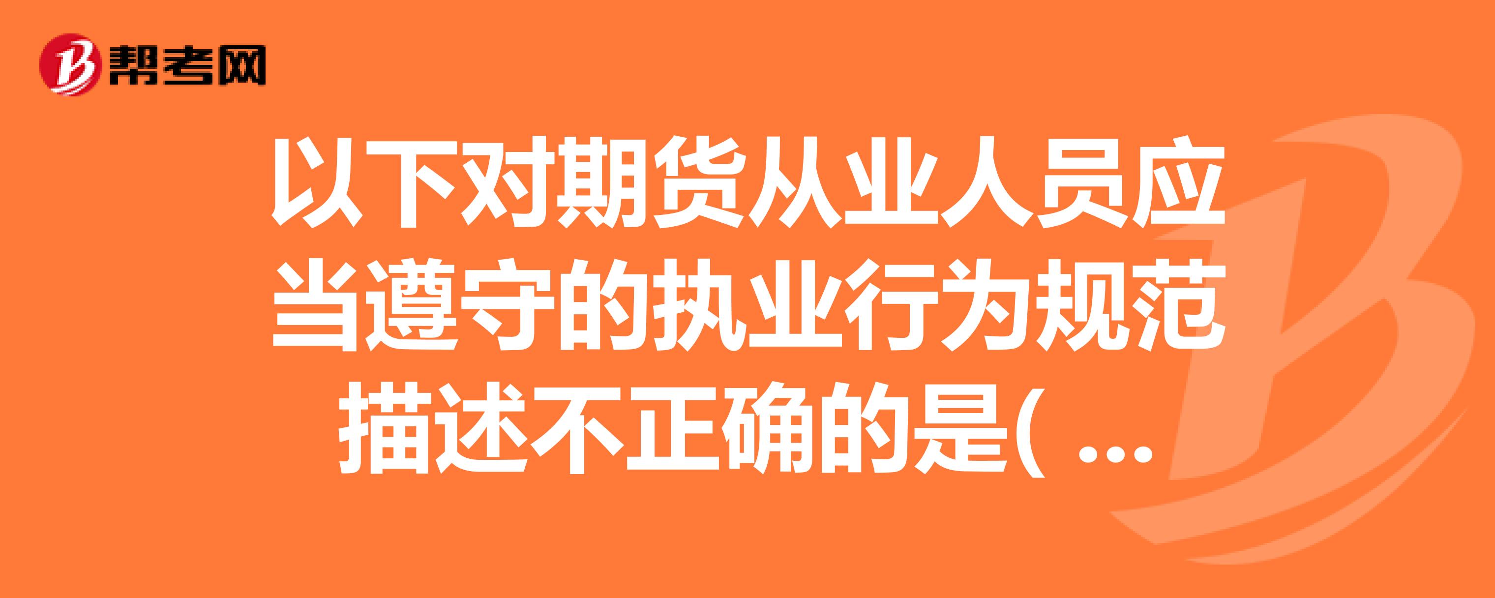 期货从业人员专业胜任能力内容是什么?:期货从业人员专业胜任能力内容如下:第十六条从业人员在从事期货业务前,应当参加岗前培训并通过考核,具备相应的专业知识、技能和职业道德。第十七条从业人员应当加强业务知识更新,第十八条机构的管理人员应当对下属从业人员的工作进行指导、监督和支持,使其保持并不断提高专业胜任能力。【例题·单选题】《期货从业人员执业行为准则》没有规定的是。【例题·单选题】为保证期货从业人员不断提高专业水平