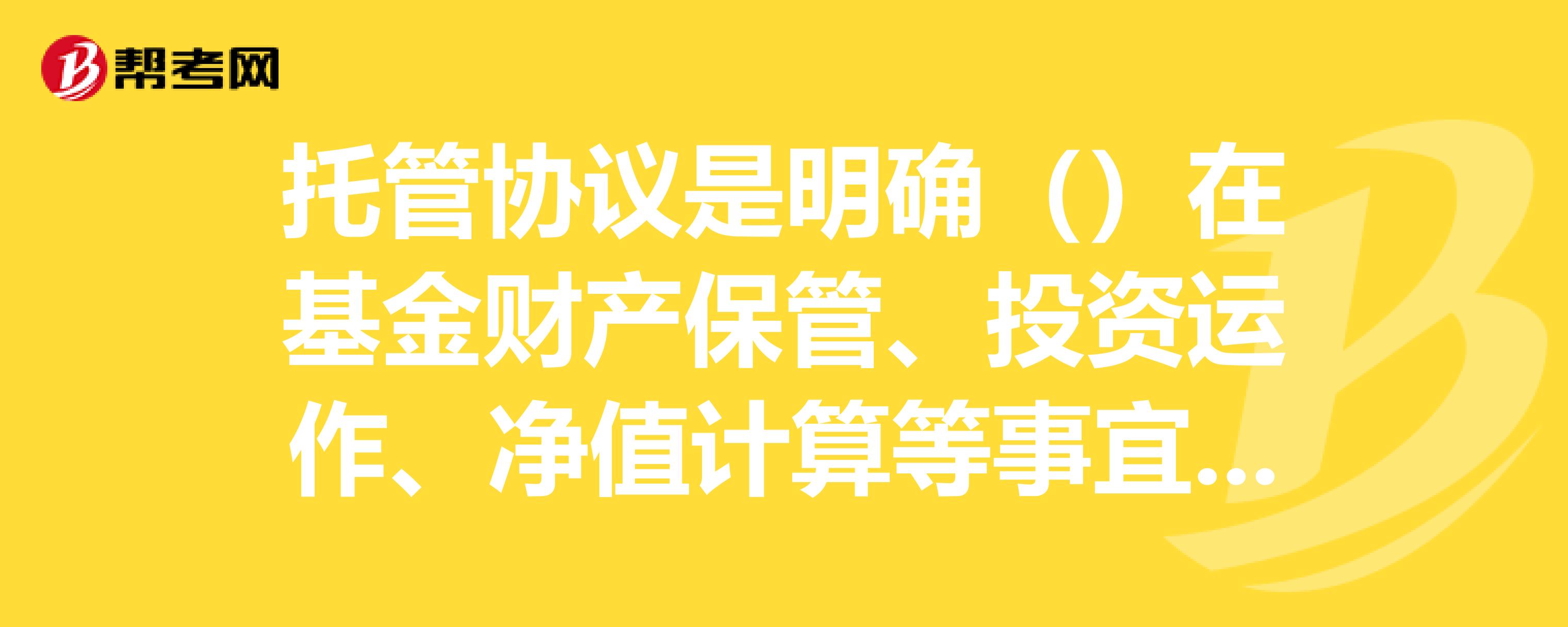来看看基金托管协议包含哪些重要信息?:来看看基金托管协议包含哪些重要信息?基金托管协议是基金管理人和基金托管人签订的协议,主要目的在于明确双方在基金财产保管、投资运作、净值计算、收益分配、信息披露及相互监督等事宜中的权利、义务及职责,基金托管协议包含两类重要信息:(1)基金管理人和基金托管人之间的相互监督和核查;A.投资人、基金管理人、基金托管人,C.基金管理人、基金托管人,【解析】基金托管协议是基金管理人和基金托管人签订的协议