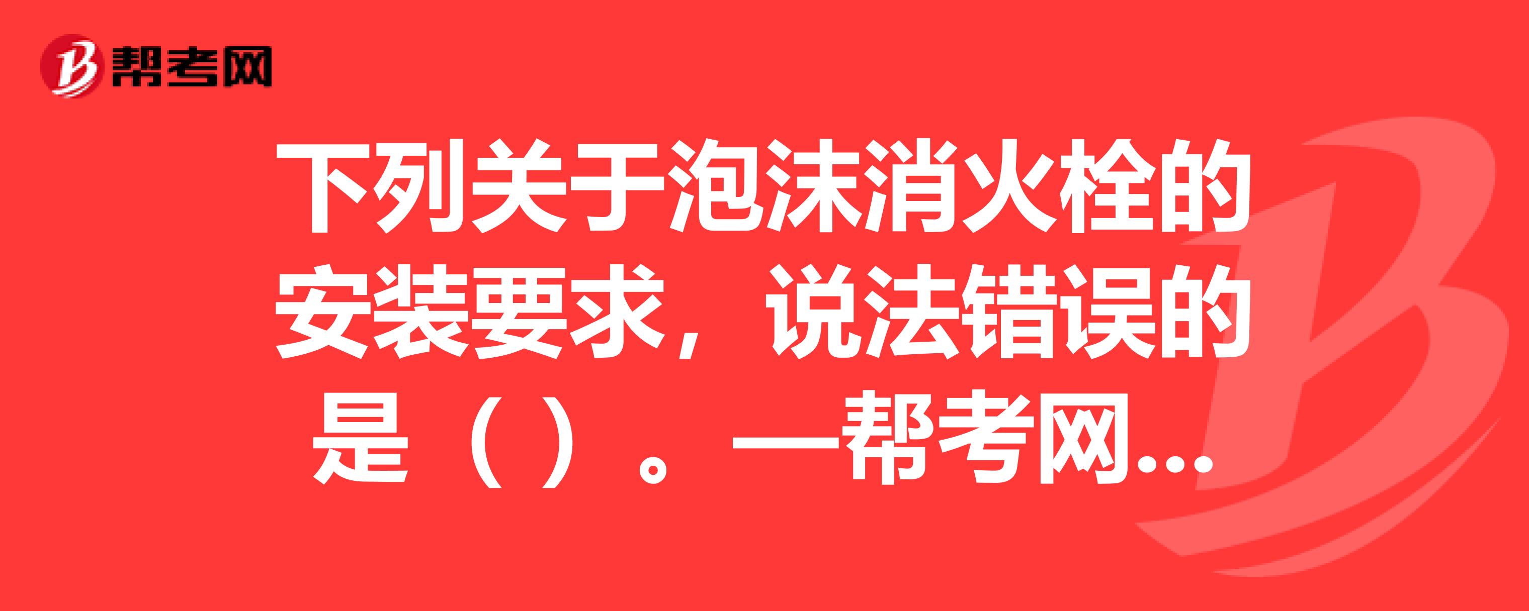 泡沫消火栓的安装要求是怎样的?:泡沫消火栓的安装要求是怎样的?泡沫消火栓主要由法兰、筒体、球阀、内接、消防管牙及端盖组成。室外管道选用地上式泡沫消火栓或地下式泡沫消火栓。室内管道选用室内泡沫消火栓或消火栓箱,2)地上式泡沫消火栓要垂直安装。地下式泡沫消火栓要安装在消火栓井内的泡沫混合液管道上,3)地上式泡沫消火栓的大口径出液口要朝向消防车道。地上式泡沫消火栓上的大口径出液口。