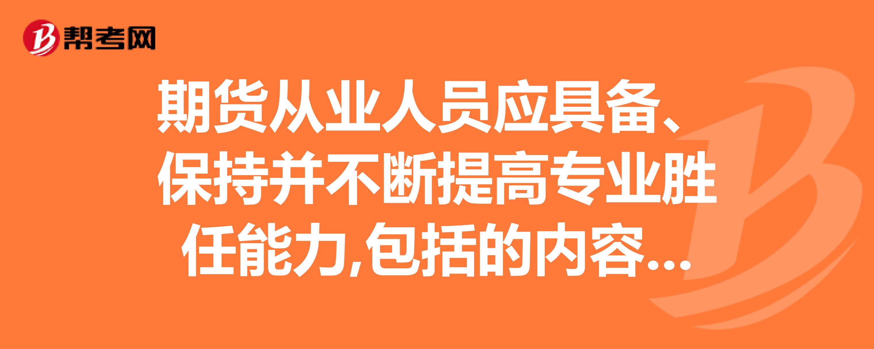 期货从业人员专业胜任能力内容是什么?:期货从业人员专业胜任能力内容如下:第十六条从业人员在从事期货业务前,应当参加岗前培训并通过考核,具备相应的专业知识、技能和职业道德。第十七条从业人员应当加强业务知识更新,第十八条机构的管理人员应当对下属从业人员的工作进行指导、监督和支持,使其保持并不断提高专业胜任能力。【例题·单选题】《期货从业人员执业行为准则》没有规定的是。【例题·单选题】为保证期货从业人员不断提高专业水平