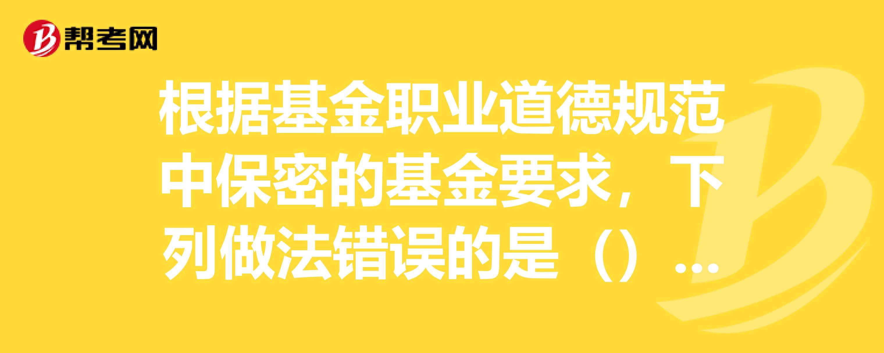 带你学习基金职业道德修养的含义及方法是什么?:带你学习基金职业道德修养的含义及方法是什么?基金职业道德修养,将基金职业道德外在的职业行为规范内化为内在的职业道德情感、认知和信念,基金职业道德修养的方法:(一)正确树立基金职业道德观念,(二)深刻领会基金职业道德规范,(三)积极参加基金职业道德实践。【例题·单选题】基金从业资格考试属于基金职业道德教育途径的( )。A.岗位职业道德教育。C.岗前职业道德教育