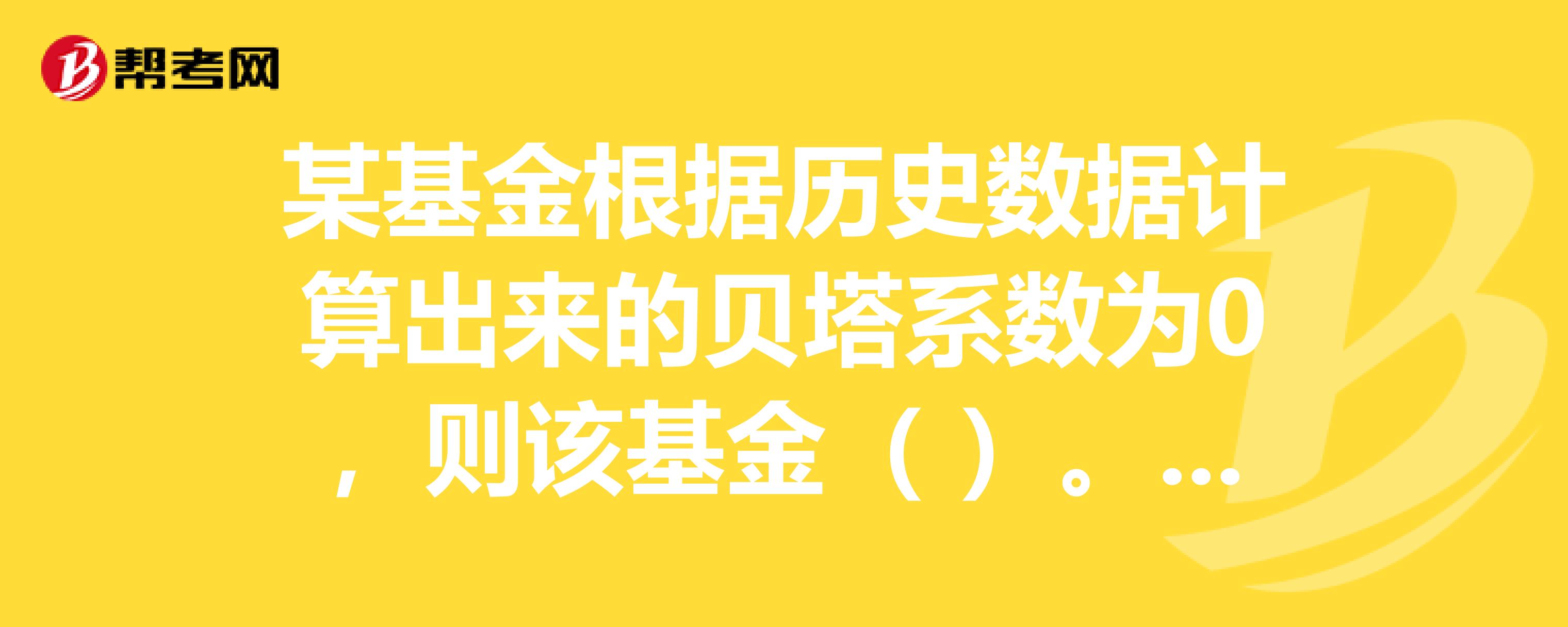 什么是股票基金的β系数?:什么是股票基金的β系数?股票基金,是指投资于股票市场的基金。证券基金的种类很多,目前我国除股票基金外,还有债券基金、股票债券混合基金、货币市场基金等。通常可以用贝塔系数(β)的大小衡量一只股票基金面临的市场风险的大小。说明该基金是一只活跃或激进型基金;如果某基金的贝塔系数小于1,说明该基金是一只稳定或防御型的基金。【例题•单选题】通常可以用()的大小衡量一只股票基金面临的市场风险的大小。