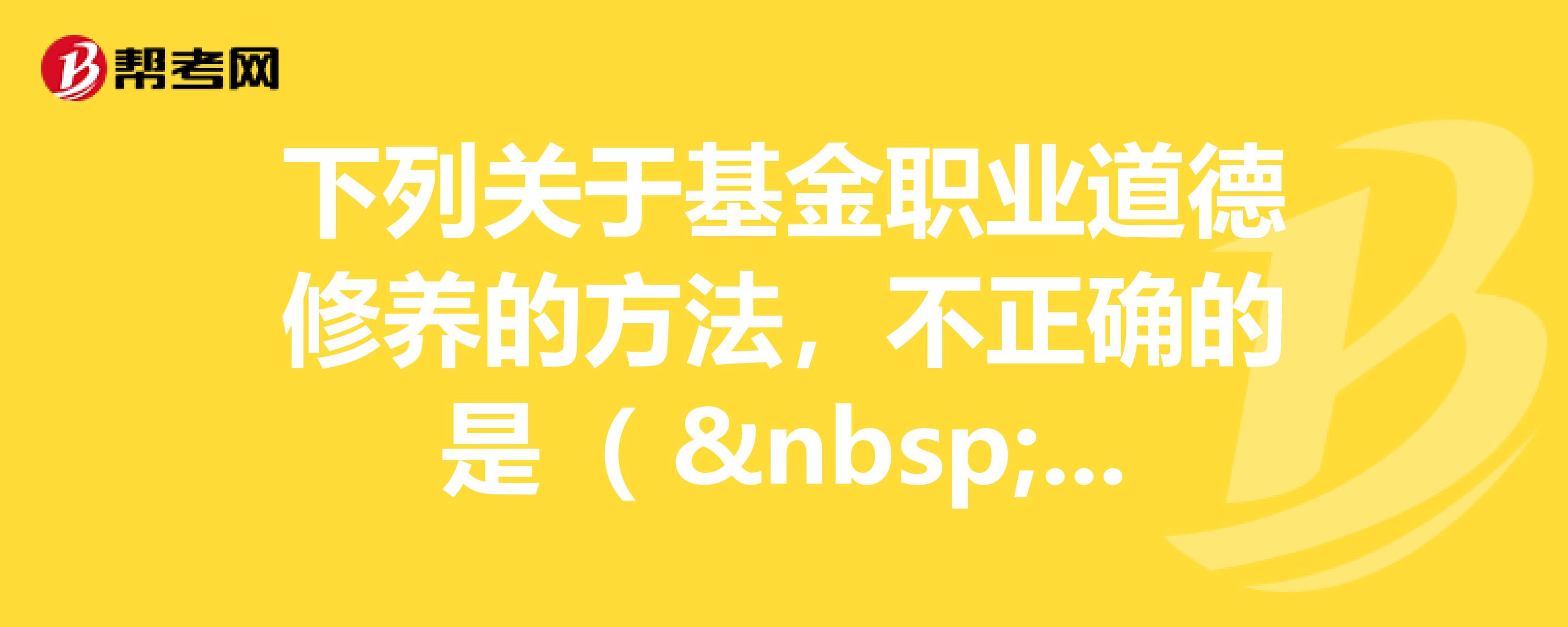 带你学习基金职业道德修养的含义及方法是什么?:带你学习基金职业道德修养的含义及方法是什么?基金职业道德修养,将基金职业道德外在的职业行为规范内化为内在的职业道德情感、认知和信念,基金职业道德修养的方法:(一)正确树立基金职业道德观念,(二)深刻领会基金职业道德规范,(三)积极参加基金职业道德实践。【例题·单选题】基金从业资格考试属于基金职业道德教育途径的( )。A.岗位职业道德教育。C.岗前职业道德教育