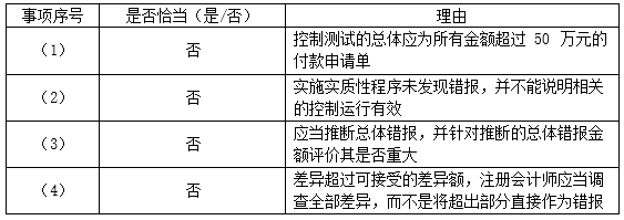- 6 【综合题(主观)】针对资料二(1)至(2)项,假定不考虑其他条件,请逐项指出上述测试结果是否表明相关内部控制得到有效执行。如果表明相关内部控制未能得到有效执行,请简要说明理由。请将答案直接填人相应表格内。