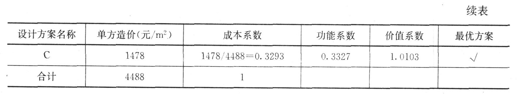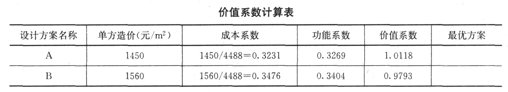 计算各设计方案成本系数、功能系数和价值系数,计算结果保留小数点后三位,并确定最优方案。