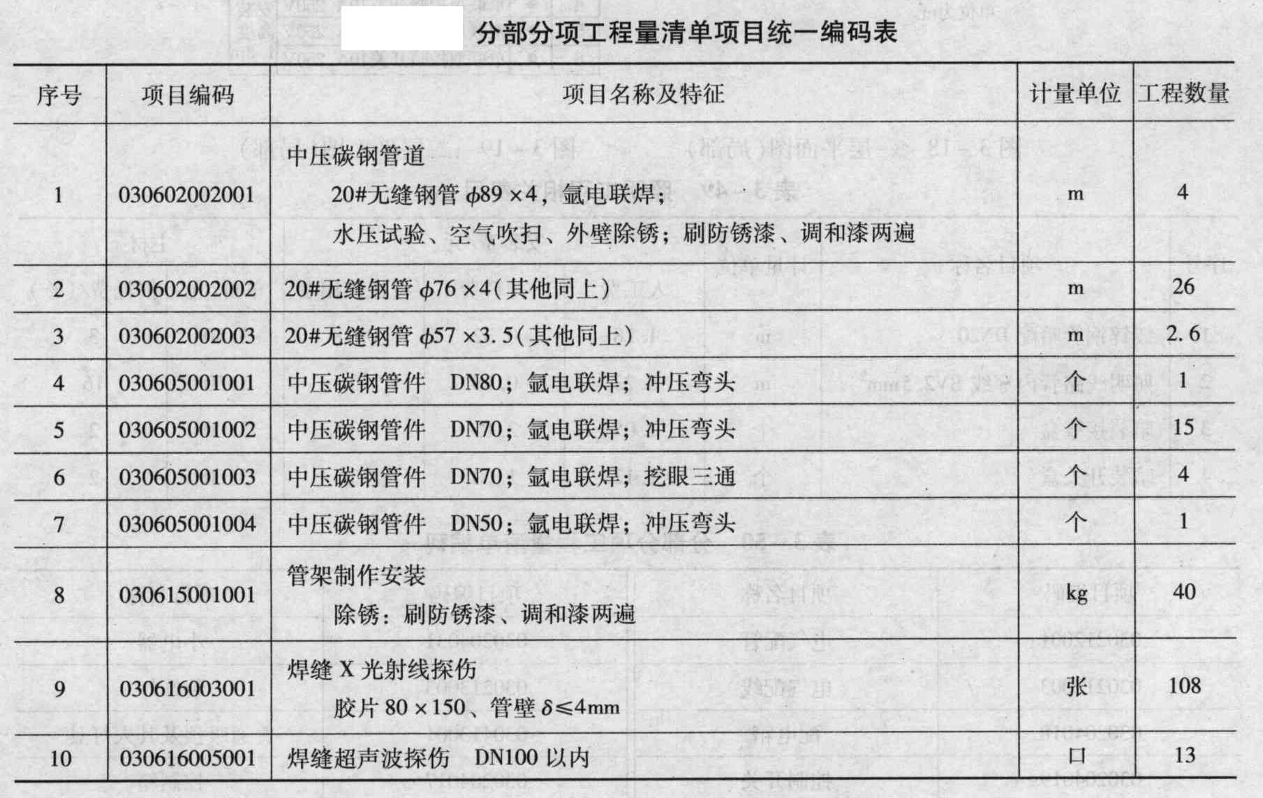 注:①本图所示为某工厂生产装置的部分工艺管道系统,该管道系统工作压力为2.0MPa。图中标注尺寸标高以m计,其他均以mm计;②管道均采用20#碳钢无缝钢管,弯头采用成品压制弯头,三通为现场挖眼连接。管道系统的焊接均为氩电联焊;③所有法兰为碳钢对焊法兰;阀门型号为止回阀为H41H-25、截止阀为J4IH-25,采用对焊法兰连接;④管道支架为普通支架,共耗用钢材42.4kg,其中施工损耗率为6%;⑤管道系统安装就位后,对Ф76×4的管线的焊口进行无损探伤。其中法兰处焊口采用超声波探伤;管道焊缝采用X光射线探伤,片子规格为80mm×150mm,焊口按36个计;⑥管道安装完毕后,均进行水压试验和空气吹扫。管道、管道支架除锈后,均刷防锈漆、调和漆各两遍。管道系统各分部分项工程量清单项目的统一编码如表所示。