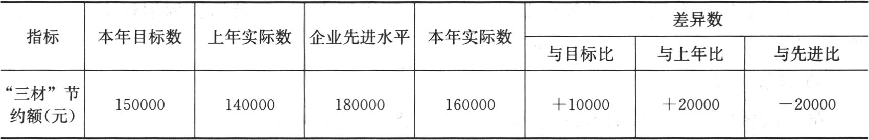 在本题中,通过计算本年成本节约实际数与本年目标数、上年实际数、企业先进水平的差异,可以直观地看到成本目标的升降幅度和实现情况,有助于确定成本控制的方向。如下表所示,成本节约实际数比目标数增加10000元,比上年实际数增加20000元,表明成本目标不但实现,而且还有提高;但是与企业先进水平相比,还有2万元的差距,应该进一步采取成本控制措施,提高成本管理水平,见下表。