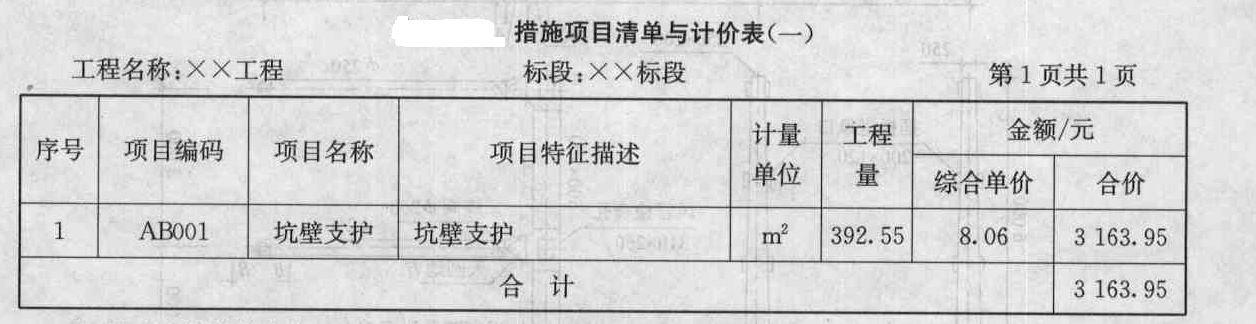 参考答案(1)填写措施项目清单与计价表(一)、(二),见表。 注:坑壁支护综合单价=7.39×(1+5%+4%)元/平方米=8.08元/平方米