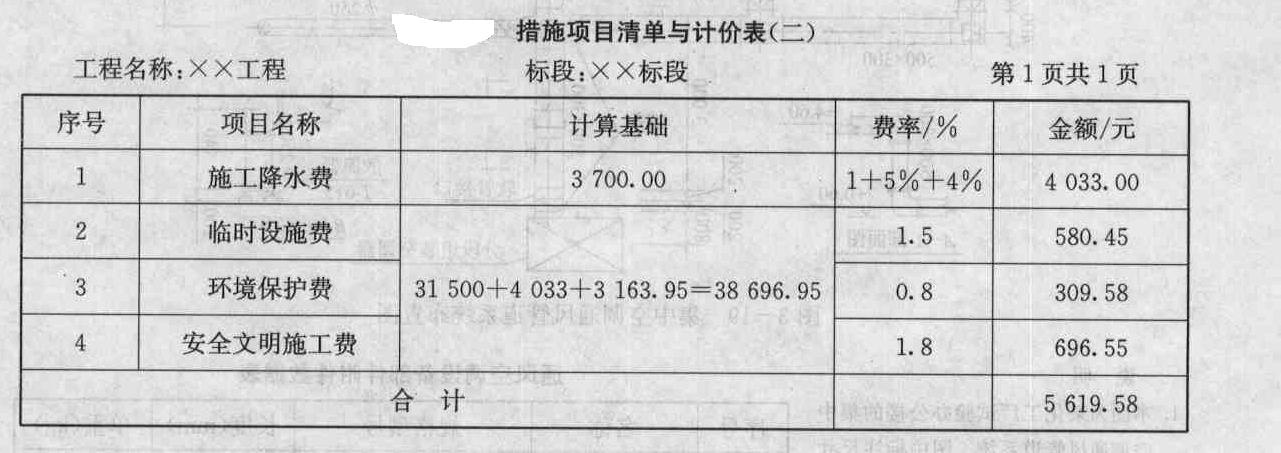- 造价师案例题某建筑物地下室挖土方工程,内容包括:挖基础土方和基础土方回填,基础土方回填采用打夯机夯实,除基础回填所需土方外,余土全部用自卸汽车外运800 m至弃土场。提供的施工场地,已按设计室外地坪-0.20 m平整,土质为三类土,采取施工排水措施。根据图基础平面图、图剖面图所示的以及现场环境条件和施工经验,确定土方开挖方案为:基坑除1-1剖面边坡按1:0.3放坡开挖外,其余边坡均采用坑壁支护垂直开挖,采用挖掘机开挖基坑。假设施工坡道等附加挖土忽略不计。已知垫层底面积586.21 平方米。有关施工内容的预算定额直接费单价见表。 承发包双方在合同中约定:以人工费、材料费和机械费之和为基数,计取管理费(费率5%)、利润(利润率4%);以分部分项工程费合计、施工排水和坑壁支护费之和为基数,计取临时设施费(费率1.5%)、环境保护费(费率0.8%)、安全和文明施工费(费率1.8%);不计其他项目费;以分部分项工程费合计与措施项目费合计之和为基数计取规费(费率2%)。税金费率为3.44%。 根据《建设工程工程量清单计价规范》(GB 50500-2008)的规定进行计算。假定分部分项工程费用合计为31 500.00元。(1)编制挖基础土方的措施项目清单计价表(一)、(二),填入“措施项目清单与计价表(一)、(二)”中。并计算其措施项目费合计。(2)编制基础土方工程投标报价汇总表,填入“基础土方工程投标报价汇总表”中。(计算结果均保留两位小数) 承发包双方在合同中约定:以人工费、材料费和机械费之和为基数,计取管理费(费率5%)、利润(利润率4%);以分部分项工程费合计、施工排水和坑壁支护费之和为基数,计取临时设施费(费率1.5%)、环境保护费(费率0.8%)、安全和文明施工费(费率1.8%);不计其他项目费;以分部分项工程费合计与措施项目费合计之和为基数计取规费(费率2%)。税金费率为3.44%。 根据《建设工程工程量清单计价规范》(GB 50500-2008)的规定进行计算。假定分部分项工程费用合计为31 500.00元。(1)编制挖基础土方的措施项目清单计价表(一)、(二),填入“措施项目清单与计价表(一)、(二)”中。并计算其措施项目费合计。(2)编制基础土方工程投标报价汇总表,填入“基础土方工程投标报价汇总表”中。(计算结果均保留两位小数)