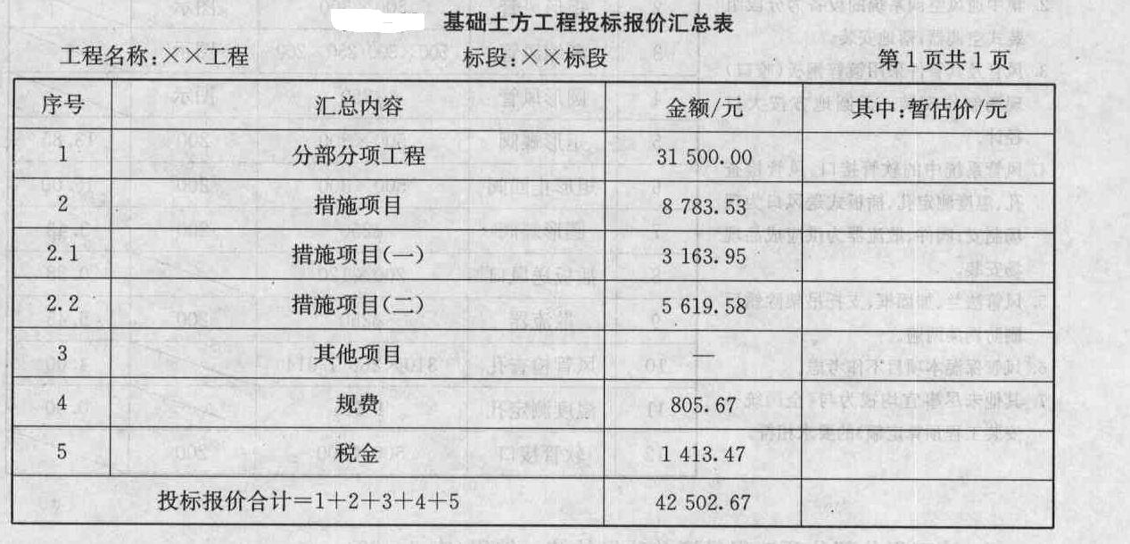(2)填写基础土方工程投标报价汇总表,见表。