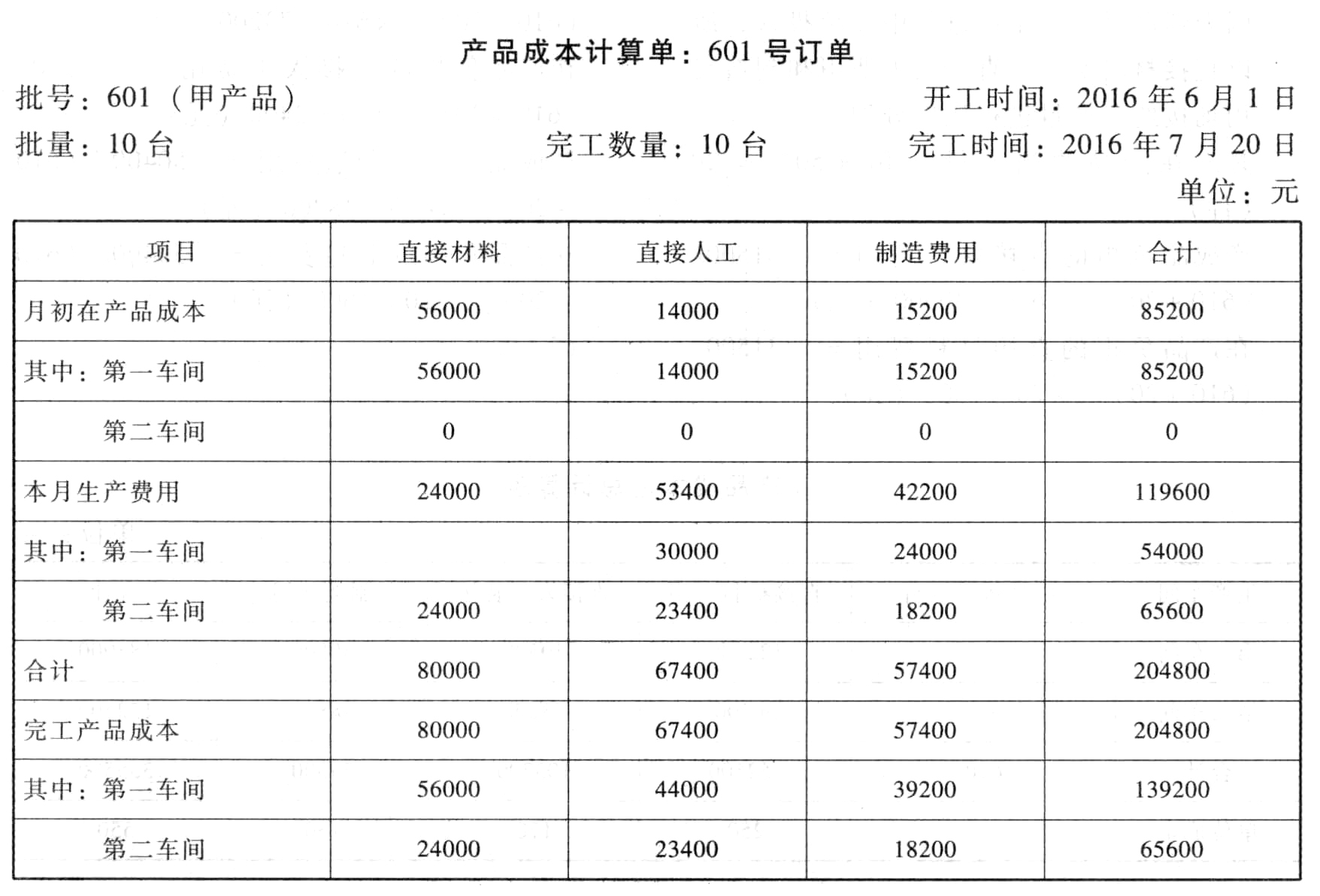 题目:计算填列601号订单的产品成本计算单(写出计算过程,计算结果填入答题卷中的表格内)。