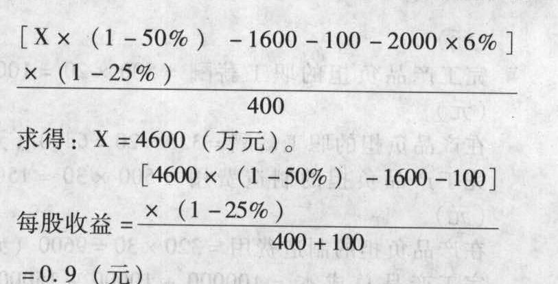(6)①设每股收益相等时的销售入为×,则有:②每股收益相等时的销售收入为4600万元,则每股收益相等时的息税前利润=4600×(Ⅱ-50%)-1600=700(万元)。