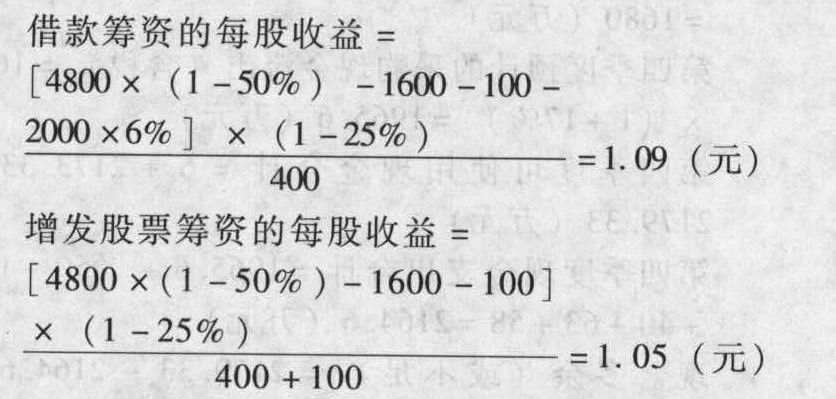 借款筹资的每股收益大于增发股票筹资的每股收益,所以应选择借款筹资。