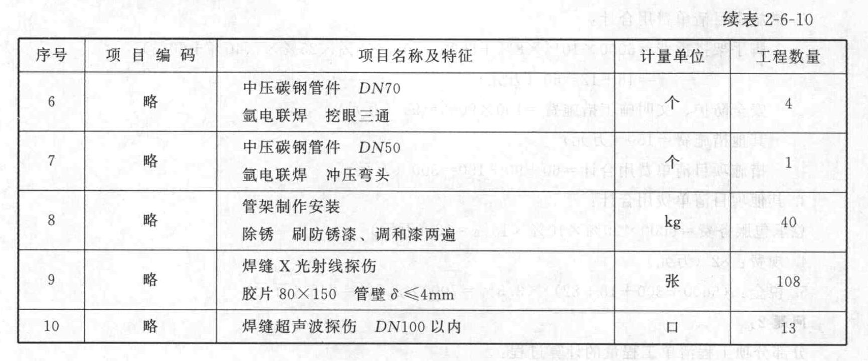 题目:根据《建设工程工程量清单计价规范》的规定,计算管道φ89×4、管道φ76×4、管道φ57×3.5、管道支架制安、焊缝X光射线探伤、焊缝超声波探伤等六项工程量,并写出计算过程(计算结果均保留一位小数)。编列出该管道系统(阀门、法兰安装除外)的分部分项工程量清单项目,将结果填入表2-6-10“分部分项工程量清单”。