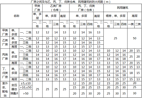 2.(1)根据《建筑设计防火规范》(GB 50016—2014)第3.4.1条规定,除本规范另有规定外,厂房之间及与乙、丙、丁、戊类仓库、民用建筑等的防火间距不应小于下表的规定。