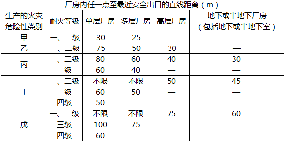 3.(1)该厂房内任一点到最近安全出口的距离符合消防规定。根据《建筑设计防火规范》(GB 50016—2014)第3.7.4规定,厂房内任一点至最近安全出口的直线距离不应大于下表的规范。