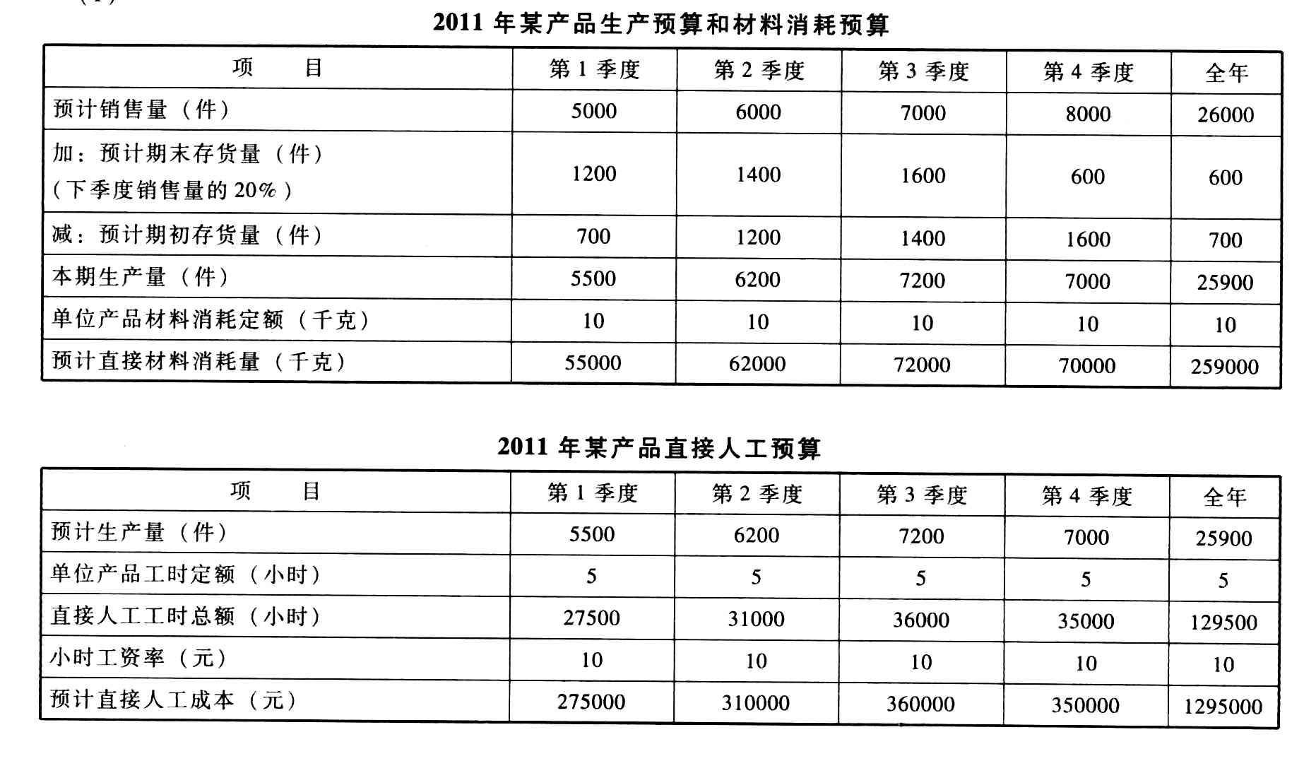 题干:某企业根据销售预测,对某种产品2011年各季度的销售量做出如下预计:2011年各季度销售量依次分别为5000件、6000件、7000件、8000件。每季度产成品期末存量为下季度销售量的20%;2011年年初和2011年年末的产成品库存量分别为700件和600件;单位产品的材料消耗定额为10千克/件,单位产品工时定额为5小时/件,小时工资率为10元。