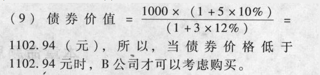 - 8 【计算分析题】假定到期一次还本付息,单利计息,折现率为12%。B公司2011年3月4日打算购入该债券并持有到期,计算确定当债券价格低于什么水平时,B公司才可以考虑购买。(复利,按年计息)。