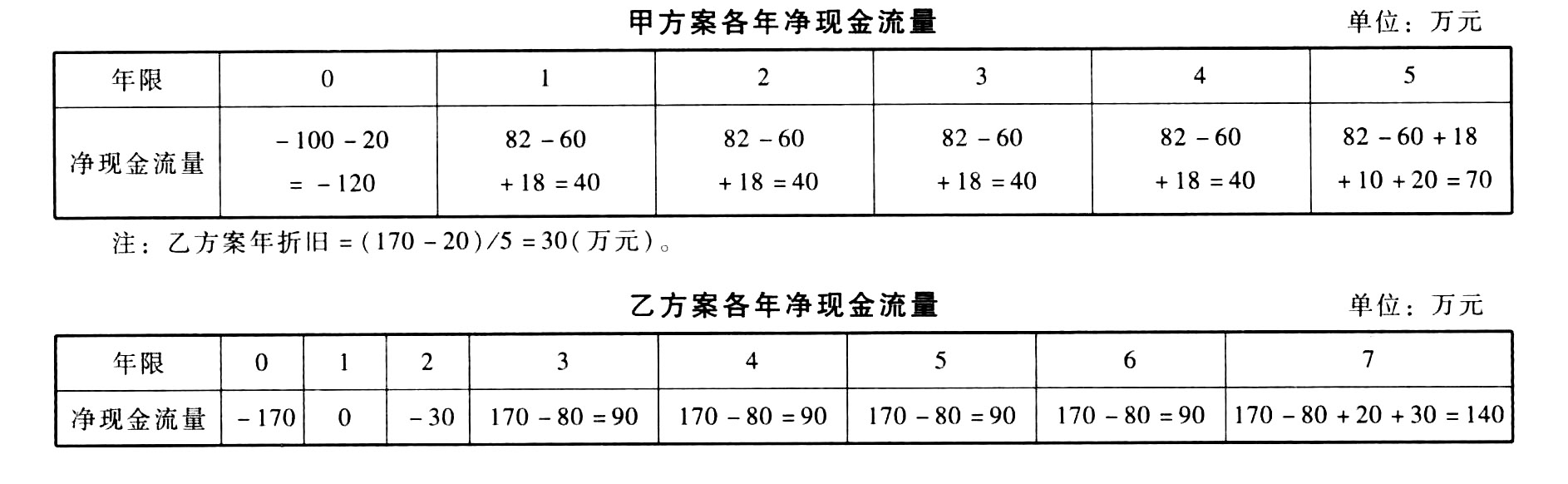 题目:计算甲、乙两个方案各年的净现金流量。