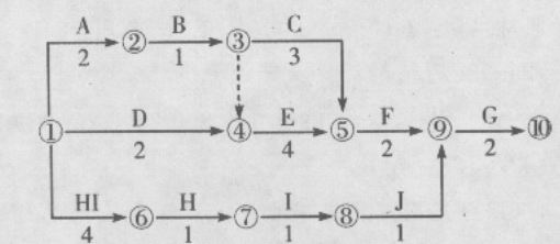 主要考查如何绘制施工网络计划图。根据背景资料,丁坝施工工作面独立,其坝基清理、坝身填筑、混凝土护坡等三项工作依次施工,在第5个月初开始施工,堤顶道路修复开工前结束。注意:H前有4个月的等待时间(HI)并与起点节点相连;箭线编号从小到大;丁坝工作的紧后工作为G工作;丁坝工作顺序为H→I→J。